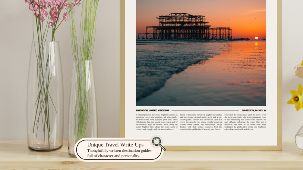 Celebrate your favourite destinations with our charming Brighton, United Kingdom travel prints. Whether you want to reminisce about past journeys or ignite your wanderlust for future adventures, our prints offer visually captivating art that will enhance any home.